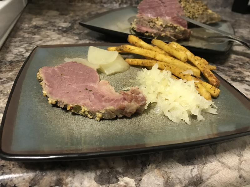 Lightly coat beef with mustard (so pickle spices adhere better). Place on trivet.